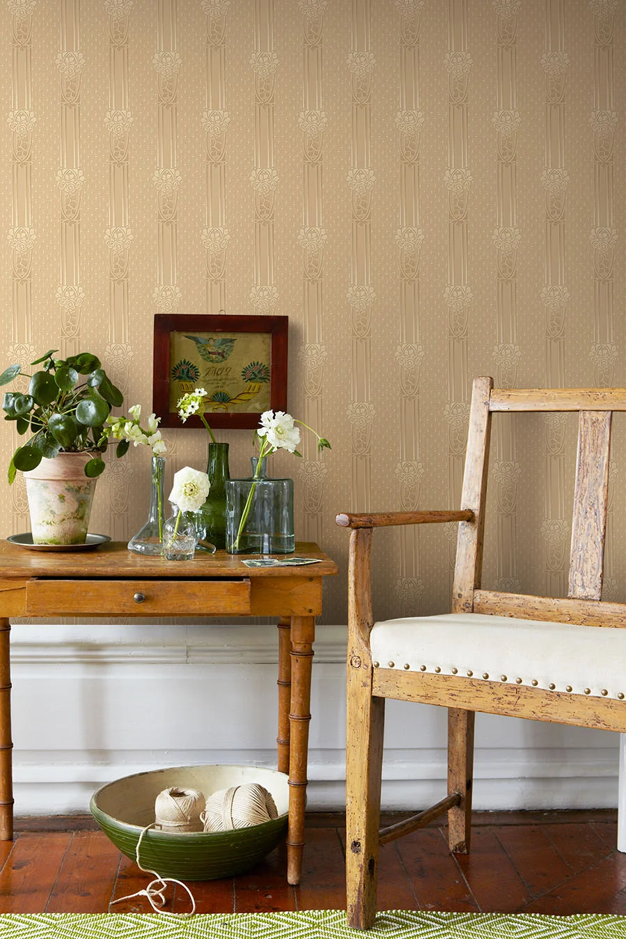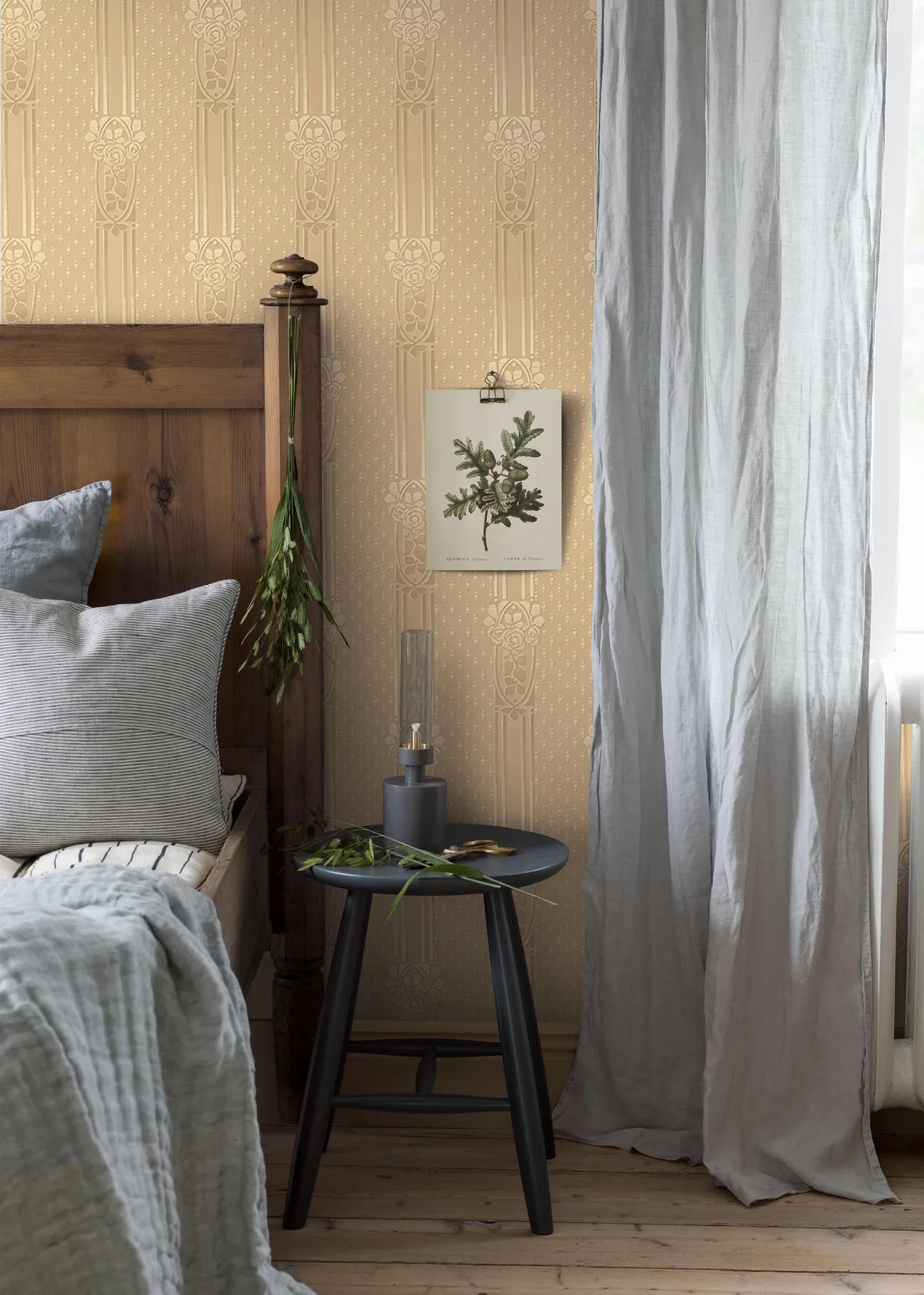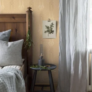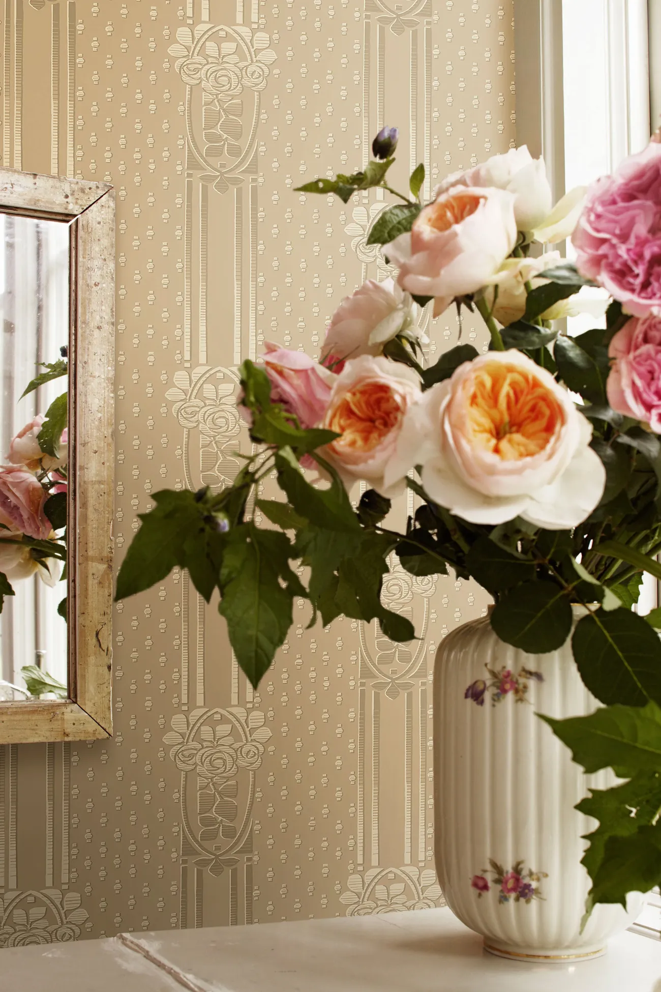 Tapeten Ellen är ett bra exempel på senare jugendstil, med dragning åt mer avskalad funktionalism. Naturen var fortfarande en stor källa till inspiration, men här i en striktare form. Den glidande färgsättningen av ränderna och blommorna ger Ellen ett levande uttryck, nästan som ett skuggspel. Tapeten finns i tre olika färgställningar, här ser du den i lejongult, beige och grått.