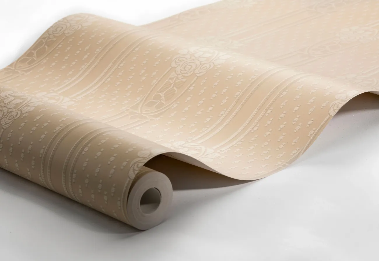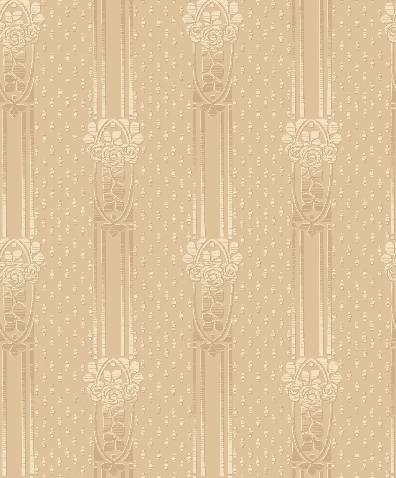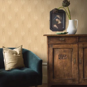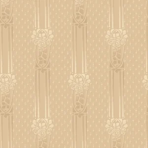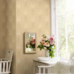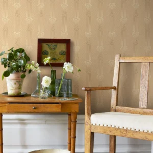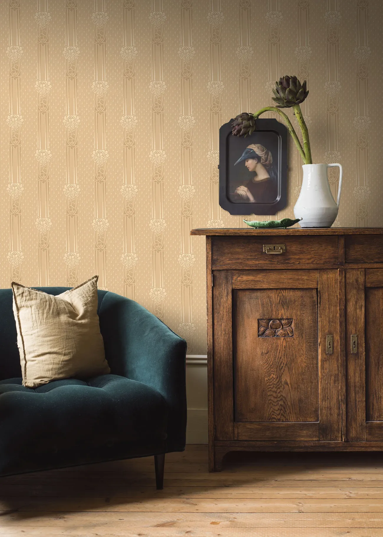 Tapeten Ellen är ett bra exempel på senare jugendstil, med dragning åt mer avskalad funktionalism. Naturen var fortfarande en stor källa till inspiration, men här i en striktare form. Den glidande färgsättningen av ränderna och blommorna ger Ellen ett levande uttryck, nästan som ett skuggspel. Tapeten finns i tre olika färgställningar, här ser du den i lejongult, beige och grått.