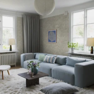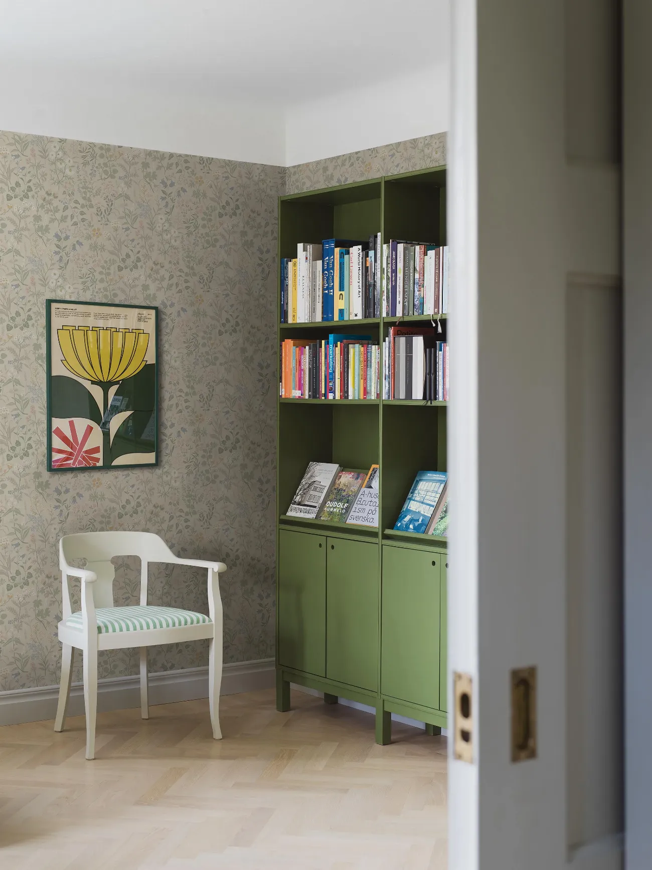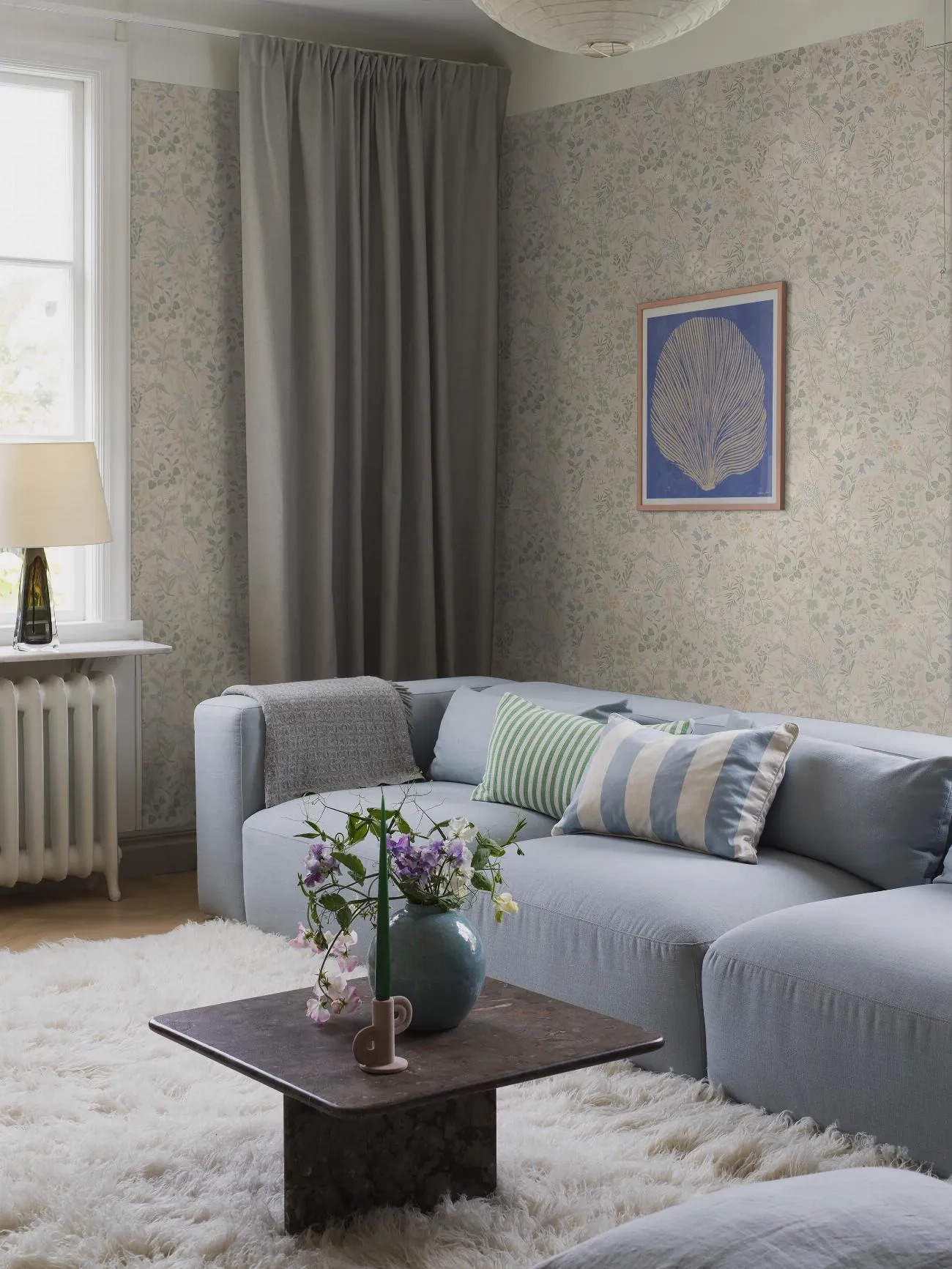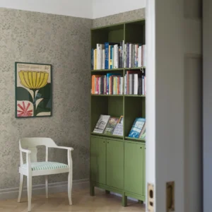 Den blommiga 50-talstapeten Floras söta mönster av enkla, stiliserade ängsblommor går i ljusa toner av blått, grönt, grått, gult, vitt och rosa på ljusbeige botten. Mönstret innehåller många färger och är därför lätt att matcha med andra detaljer i rummet. Helheten blir lugn, harmonisk och ombonad. Denna typ av mönster var vanlig under 1940- och 1950-talen som en kontrast till funkisens strama arkitektur. I takt med att folkhemmet växte fram blev funkisen också lite mjukare och just folklig.