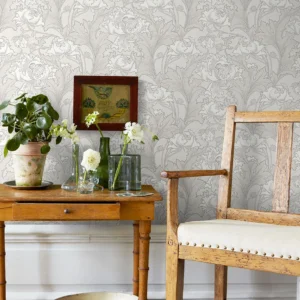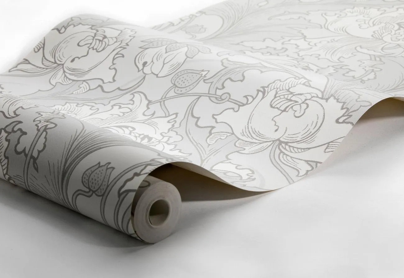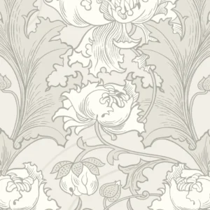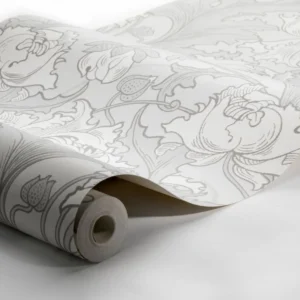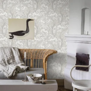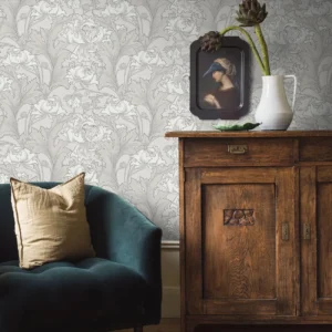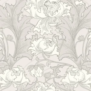 Den storblommiga tapeten Siri är från 1890-talet och ett tidstypiskt exempel på den nya stilen Jugend, även kallad Art Nouveau; ett kraftfullt, organiskt mönster av stora, slingrande vallmoblommor. Tapeten finns i tre vackra färgställningar, här ser du den ljusaste av dem i grå nyanser med crémevita blommor.