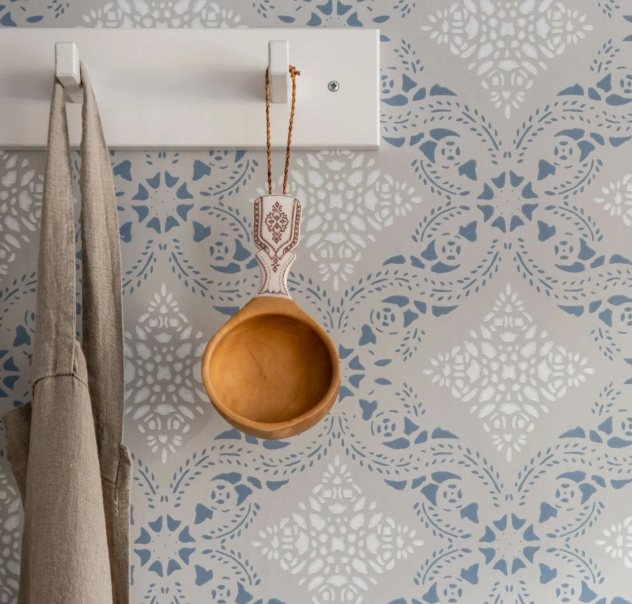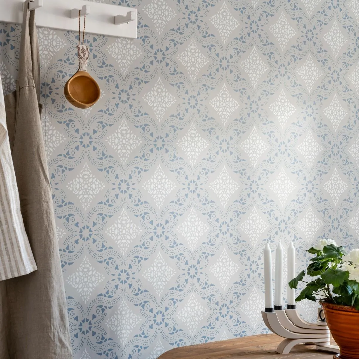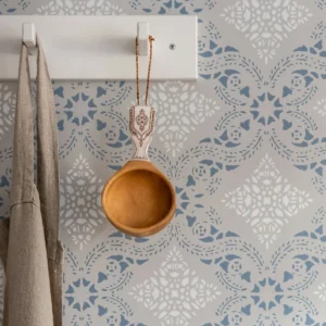 Alldeles nära Vadstenakloster finns Dahlströmska gården med anor från 1700-talet. Där har vi hämtat motivet som legat till grund för vår tapet. Mönstret är från början en del av ett schablonmåleri och kommer från de väggmålningar som fanns på gården fram till 1860-talet. Schablonmålning har anor från medeltiden men hade sin blomstringstid under 1700- och 1800-talen. Tekniken att måla med schabloner var en flitigt använd metod för att dekorera väggar i bostadshus. Det var vanligt att schablonmåla hela väggar som en ersättning för den dyrare nymodigheten papperstapeter. Fragment av de gamla målningarna och tapeterna har bevarats och kan fortfarande ses på Dahlströmska gården i Vadstena.
