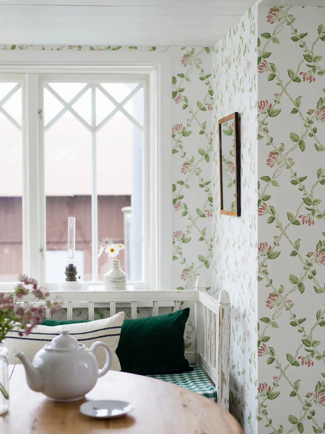 Den ljusa, storblommiga tapeten Honeysuckle har ett trellisliknande mönster av slingrande vildkaprifol. Inspirationen är hämtad från Bohuslän, där de gröna rankornas blekrosa blommor höljer klipporna i en himmelskt söt doft när skymningen faller om sommaren. Här ser du blommönstret mot en varm, vit botten. Mönstret finns också i en annan färgskala med mörkblå fond. Båda är lika fin till exempel i köket eller vid matplatsen.