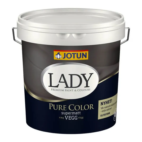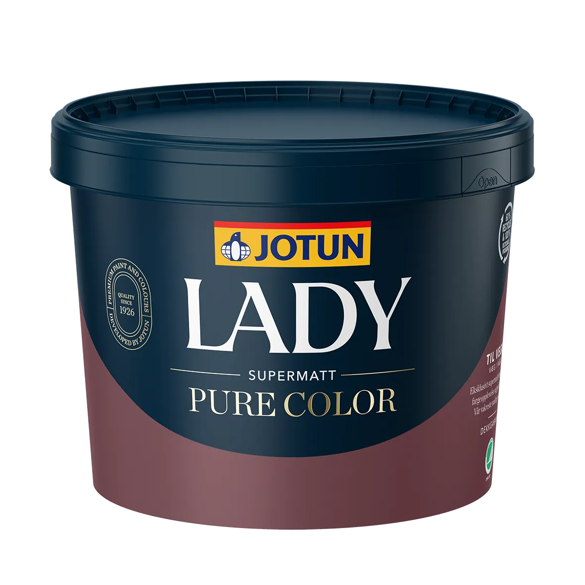 Att skapa målarfärg av högsta kvalitet kräver de bästa ingredienserna, de mest avancerade blandningsteknikerna och en känsla för estetik. Alla färger måste vara vackra på stora väggytor och framstå lika under alla ljusförhållanden. För att uppnå detta utan att göra avkall på täckförmåga och slitstyrka, har alla våra färger genomgått krävande tester. Med den nya supermatta finishen hos LADY Pure Color kommer varje färgnyans till sin rätt och du får den perfekta färgen du var ute efter. Supermatt exklusivt utseende Unik kulörupplevelse Slitstark Täckgaranti LADY Pure Color väggfärg är miljömärkt med Svanen. Färgerna tillblandas enligt önskemål i rullistan alternativt att man anger sina önskade kulörer i kassan. Vit är standardkulör.