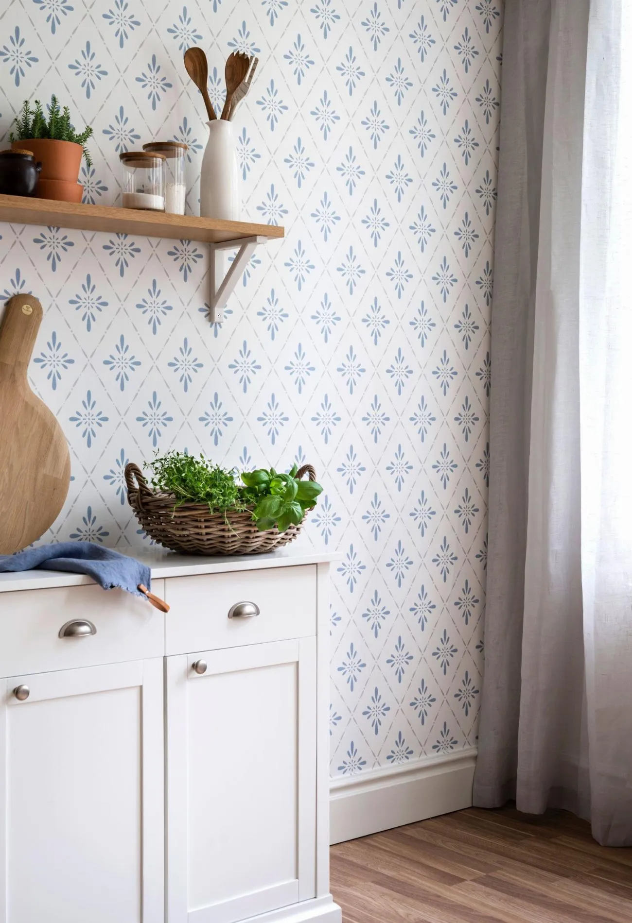 Den lantliga stilen är hemtrevlig och älskad och kommer och går under hela 1900-talet. Under 90-talet var den lantliga stilen söt och stugromantisk med bland annat träpaneler och furu. Tapeterna hade varma och klara färger och mönstren innehöll ofta stjärnor och ränder. Något som var populärt under 90-talet var att man matchade olika tapeter i samma stil i ett hem, gärna stora och små mönster. Ljungbacka tolkar en av våra mest omtyckta mönster till en mer nutida tapet som är lika fin idag som den skulle ha varit 1995.