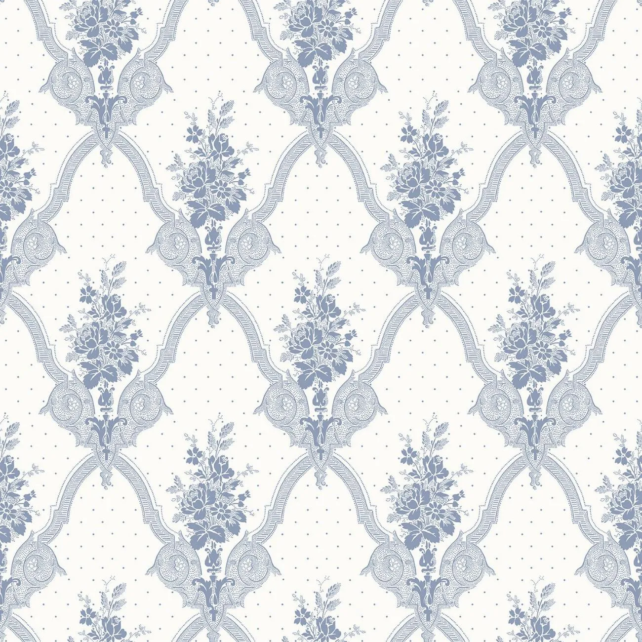 Förlagan till Magasinet är en tapet i nyrenässansstil, som daterats till 1865-1890. Fragmentet återfanns i vårt eget arkiv. Den sirliga medaljongen var omtyckt och levde kvar i nästan oförändrad form ända fram till sekelskiftet. En av de mest populära stilarna under 1800-talet var nyrenässansen, som började sitt segertåg under 1850-talet. I nystilarna sökte man en viss stämning och stil snarare än direkt historisk korrekthet. Formerna hämtades från äldre mönsterböcker och omarbetades till nya varianter. Mönstren är symmetriska, ofta i medaljongform. De förekom ofta i gråskalan, med detaljer i avvikande kulör, ofta rödbrunt och blått.