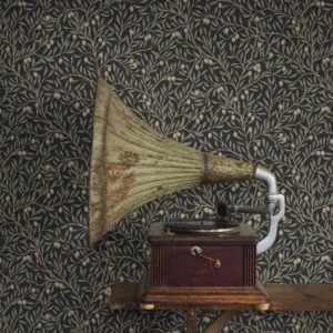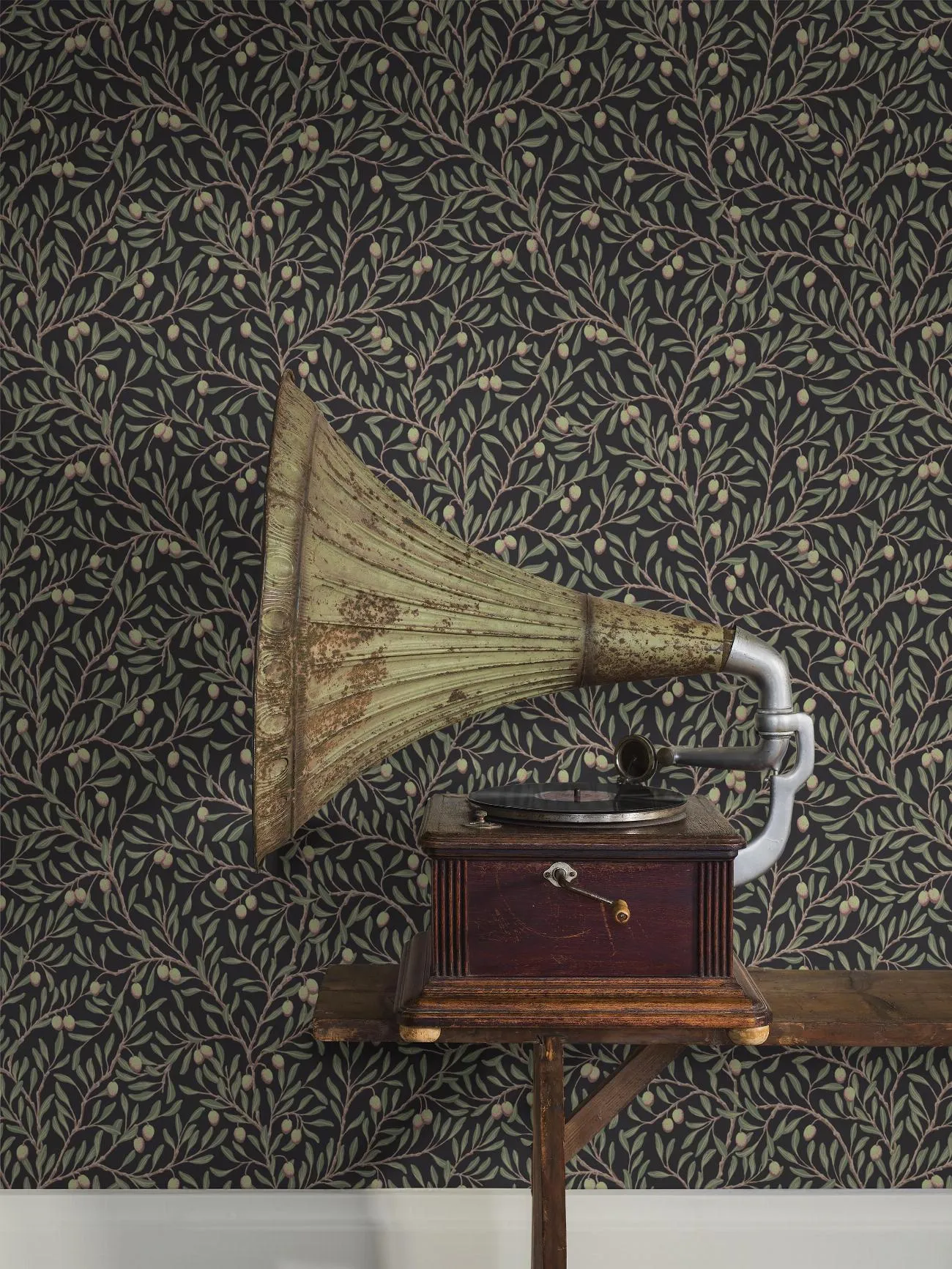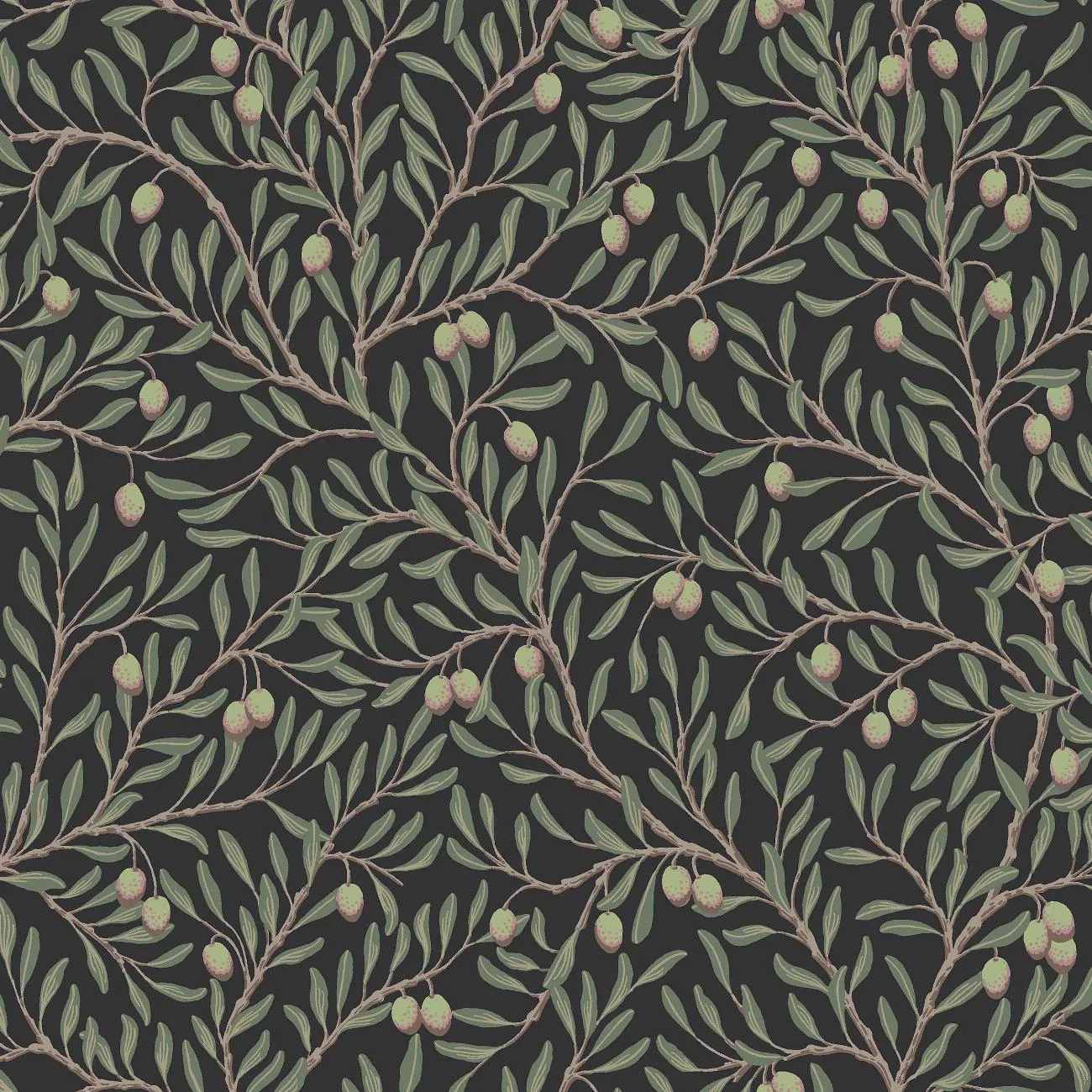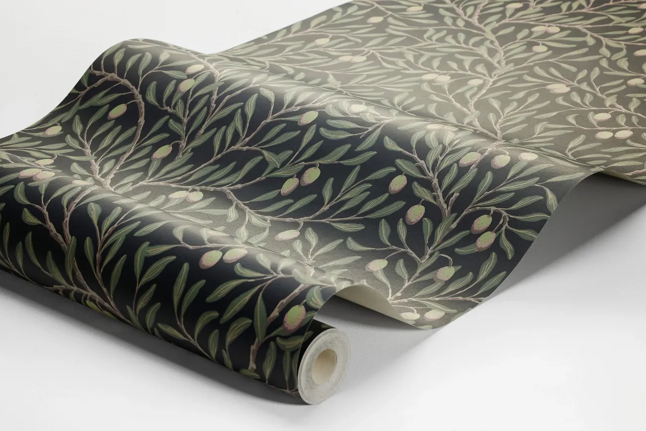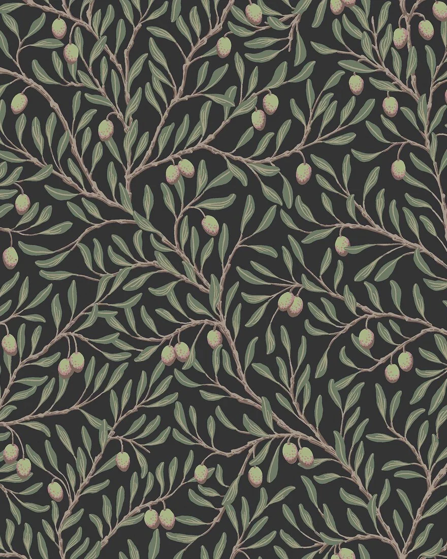 Den svarta, mönstrade tapeten Olivträd skapar en varm, ombonad atmosfär, samtidigt som den täta mönsterbilden utgör en lugn fond till övrig inredning. Mönstrets stiliserade olivkvistar är målade för hand av Nora Tysklind för att sedan tryckas med traditionellt limtryck för en rustik, levande yta.Här ser du tapeten Olivträd med gröna blad, brungrå kvistar och friskt limegröna oliver med röda accenter på svart botten. En välkomponerad, tidlös tapet som är lika fin i klassiska hem som i moderna miljöer.