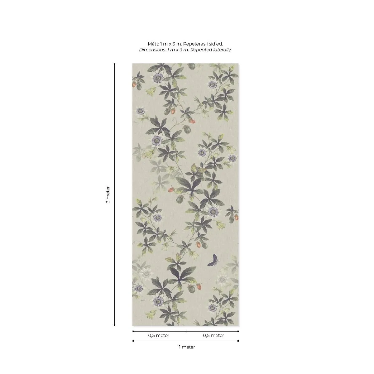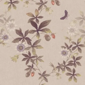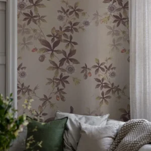 Passiflora är ett handtecknat mönster. Blad och grenar slingrar sig mjukt över väggen. Passionsfrukter och dess vackra blommor letar sig uppåt. Mönstret väcker odlardrömmar till liv. Designat av en våra skickligaste botaniska tecknare, Ingela Backman. Vi tänker på utsökta illustrationer och bokverk med sirliga teckningar. I botten finns ett textilmönster.