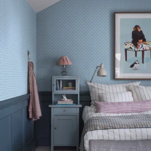 Designern Cecilia Pettersson har formgivit den mönstrade tapeten Pippi med ett modernt uttryck som också flirtar med 70-talets lekfulla formspråk. Pippins stiliserad form fyller ytan och skapar ett mönster som på håll nästan ser enfärgat ut. En tapet som är stilren, lekfull och formstark på samma gång. Fin i såväl hall eller sovrum som i kök eller vardagsrum. Den grafiska, limtryckta tapeten Pippi finns i två färgställningar, här med härligt himmelsblå fåglar på vit botten.
