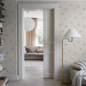 Saga är en blommig tapet hämtad från vårt historiska tapetarkiv. De sirliga blommorna och fondens diskreta linjer känns väldigt typiskt 1920-tal. Visst påminner mönstret också lite om forna tiders finporslin? En luftig, lätt tapet som ger rummet en lugn, hemtrevlig och klädd känsla.Här ser du Saga i en ljus, helmatt färgställning i traditionellt limtryck. Porslinsvit botten med mönster i pudriga toner av rosa, grönt och beige. Tapeten finns också i två andra färgställningar.