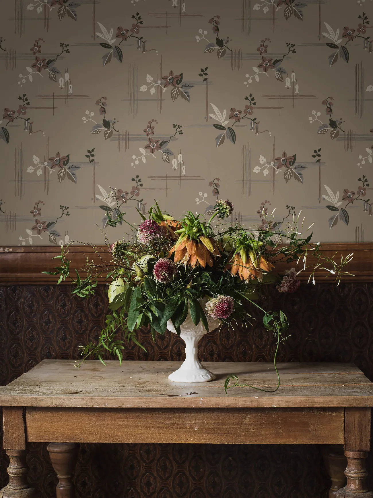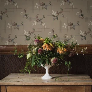 Salängen är en klassisk 1920-talstapet som vi nu återskapar från ett original hämtat ur vårt historiska tapetarkiv. De stiliserade blommorna, det strikta men ändå lite lekfulla linjespelet och den luftiga känslan är alla typiska för denna tidsperiod och denna typ av mönster var populära långt in på 1930-talet.Vi trycker tapeten i två färgställningar. Här ser du Salängen med varmt gråbrun botten med diskret vävmönster och detaljer i dova nyanser av mörkgrönt, blått, brunt, rostrött och cremevitt.