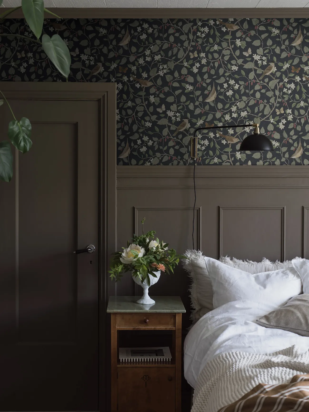Skönsjungande näktergal, svarthätta och törnsångare samsas med fladdrande fjärilar, doftande schersmin och slingrande mullbärskvistar — en blommig tapetdröm signerad Sissa Sundling. Inspirationen är från en sommarträdgård i Skåne, och mönstret skapades med krita och akvarell våren 2021. Nu trycker vi denna fantastiska tapet i två färgställningar. Här med dämpat svart botten som får bladslingor och vit schersmin att framträda vackert. Här finns också milda toner av grönt, brunt, beige och mullbärsrött.