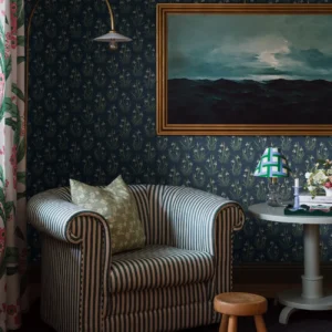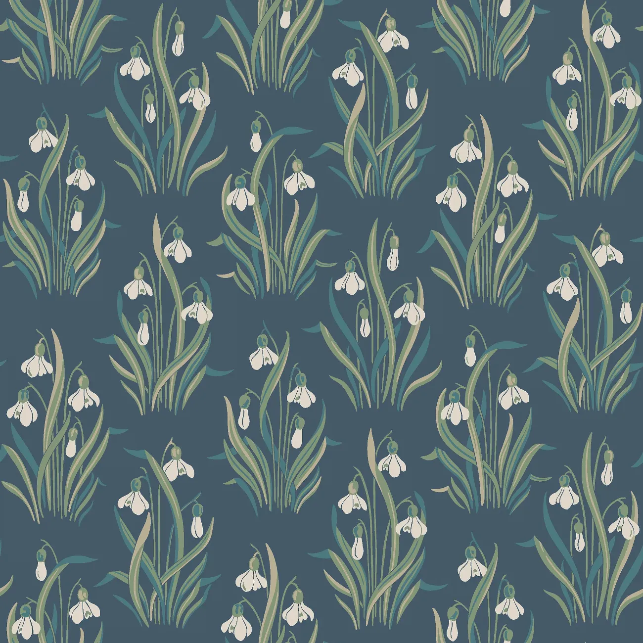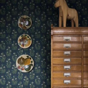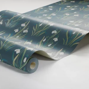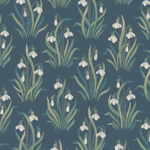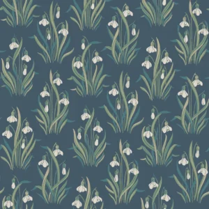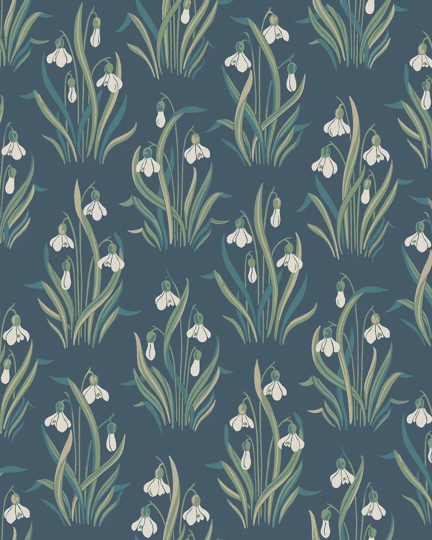 Den blommiga tapeten Snödroppe pryds av ett vårigt Flora och Fauna-mönster – klassisk, svensk naturromantik i jugend-anda.. Med inspiration från en vårdag vid kolonilotten skapade Jenny Hahne Gadd dessa näpna buketter av stiliserade snödroppar. Ett rymtiskt, organiskt mönster som passar fint i såväl vardagsrum och matsal som i sovrum eller hall. Snödroppe limtrycks i tre färgställningar. Här ser du tapeten med äggskalsvita snödroppar och grönt bladverk med inslag av turkos och mandelbeige på blå botten.