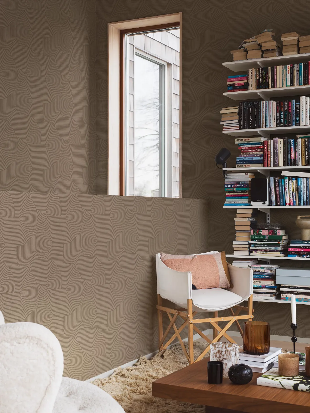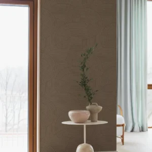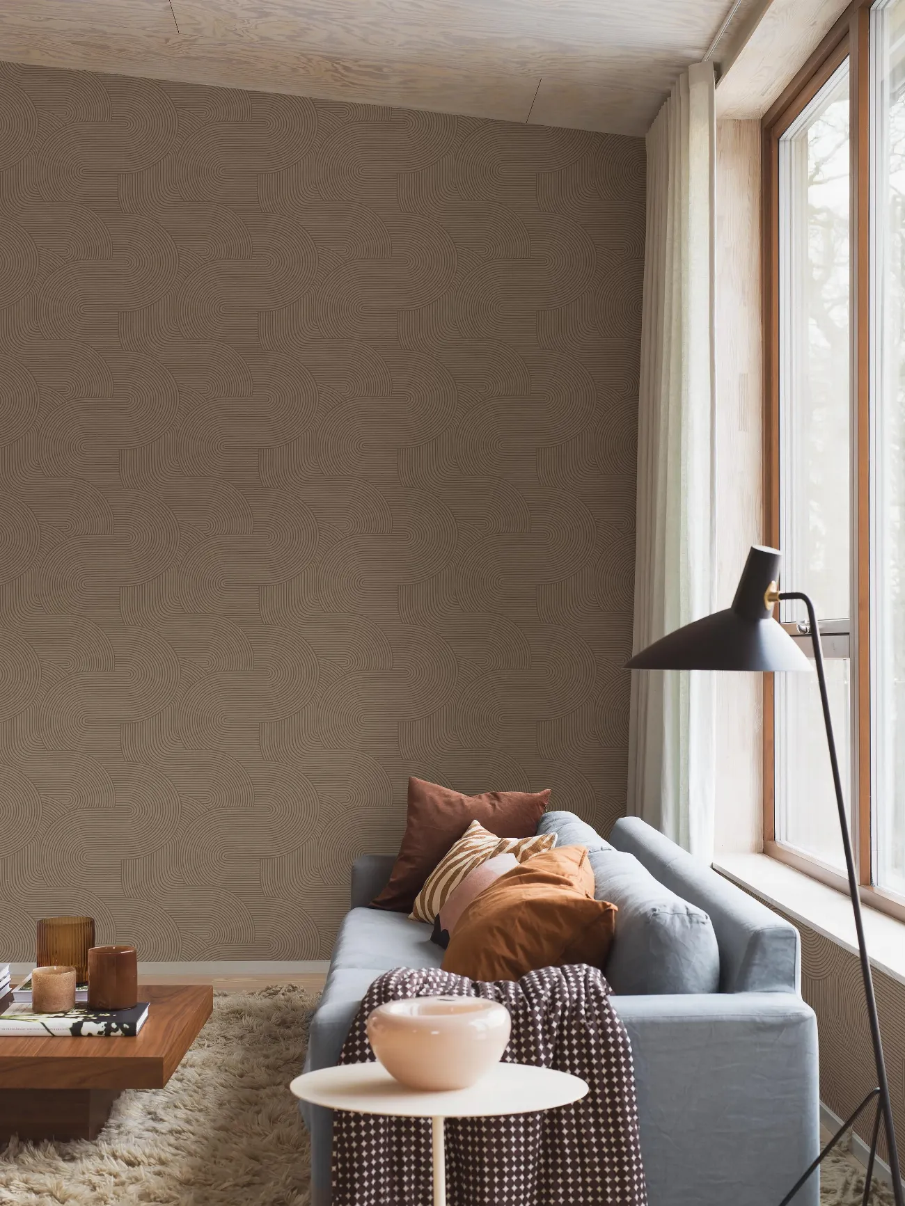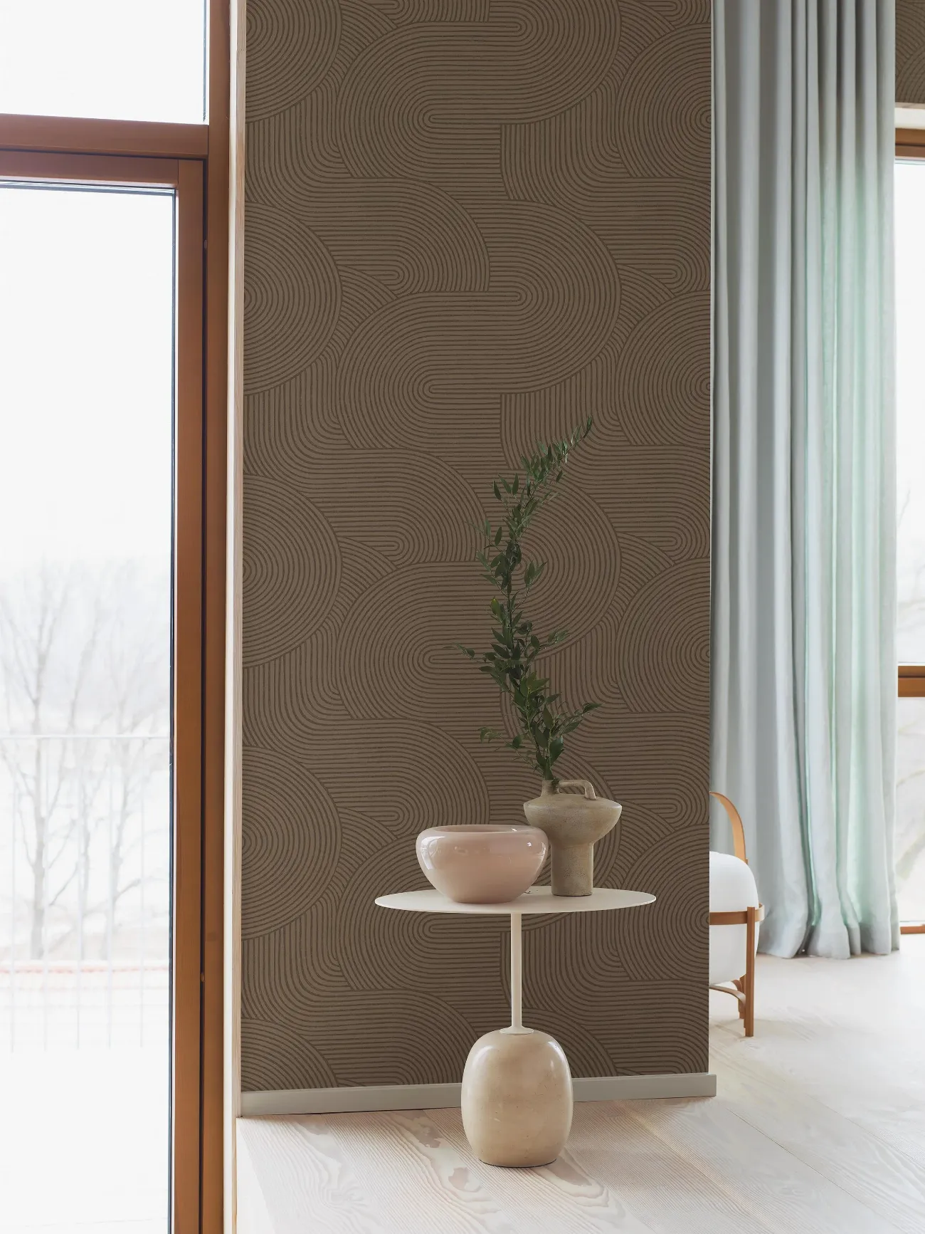 Den grafiska tapeten Zen pryds av mjukt böljande linjer – nästan som de krattade sandmönstren i en traditionell, japansk zenträdgård. Uttrycket förstärks av en diskret sandstruktur som ger tapeten en matt, sträv yta. Det visuella och taktila smälter samman i en rofylld, harmonisk helhet på väggen Här ser du den grafiska tapeten Zen i en neutralt, brun färgställning.
